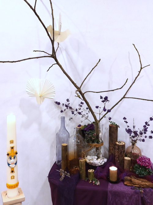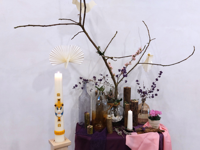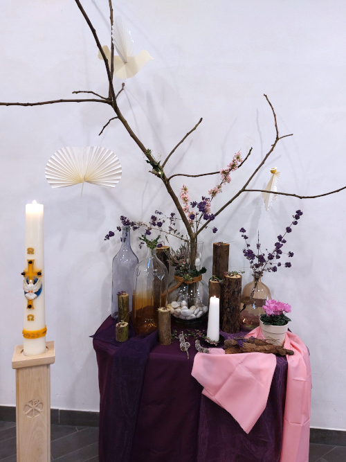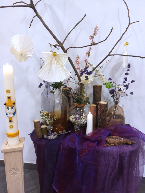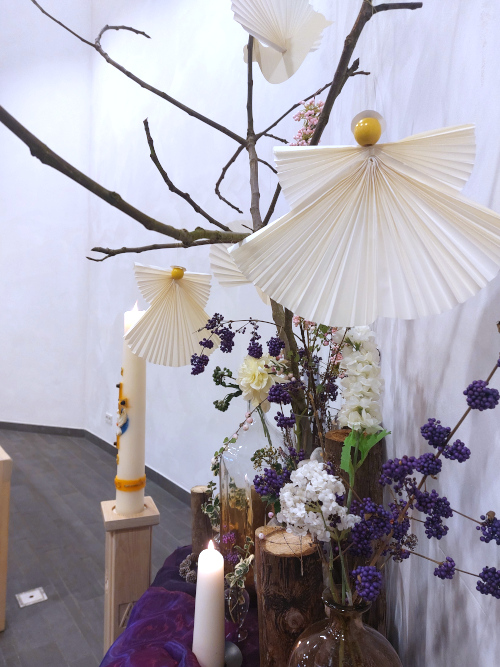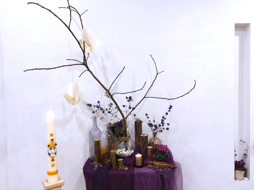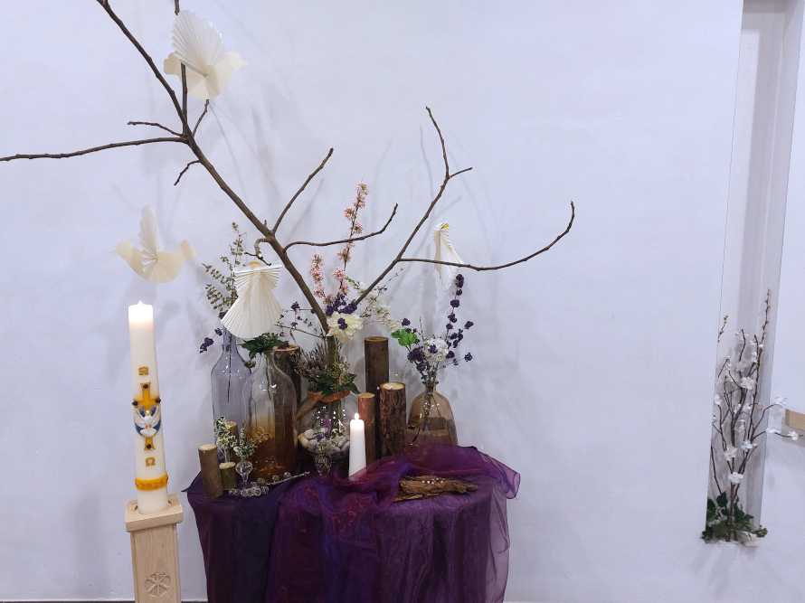 Derde Advent 14 december 2025 - Matteüs 11:2-11 Bij de liturgische schikking: Er zweven twee duiven en er verschijnt een engel. Woorden bij de schikking: Boodschappers van de Geest. |