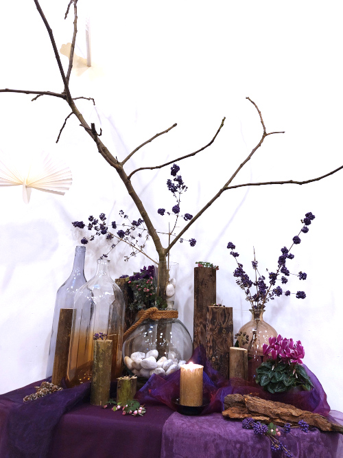 Tweede Advent 7 december 2025 - Matteüs 3:1-11 Bij de liturgische schikking: Een kale vijgenboom. Er zweven twee duiven. Woorden bij de schikking: Twee duiven, boodschappers van de Geest. |