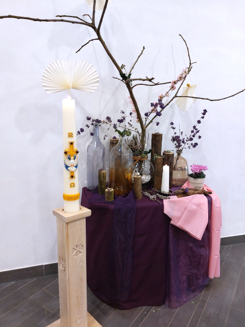 Vierde Advent 21 december 2025 - Matteüs 1:18-25 Jozef, afstammeling van David, was een rechtschapen man en wilde zijn aanstaande vrouw Maria niet in opspraak brengen. Toen kreeg Jozef een betekenisvolle droom. Wat zal hij verrast zijn door de boodschap van de engel! Zijn vrouw was uitgekozen. Hun zoon zou de langverwachte Immanuel worden. God wilde zich op bijzondere wijze openbaren in een mens: Jezus Christus. Een mensenleven kan een onverwachte wending krijgen. Houden wij in ons eigen leven rekening met onverwachte scenario’s? Laat je, net als Jozef, verrassen door het werk van de Geest. Bij de liturgische schikking: Er zweven twee duiven en twee engelen. Woorden bij de schikking: Van paars naar roze, van stilte naar vreugde. |
