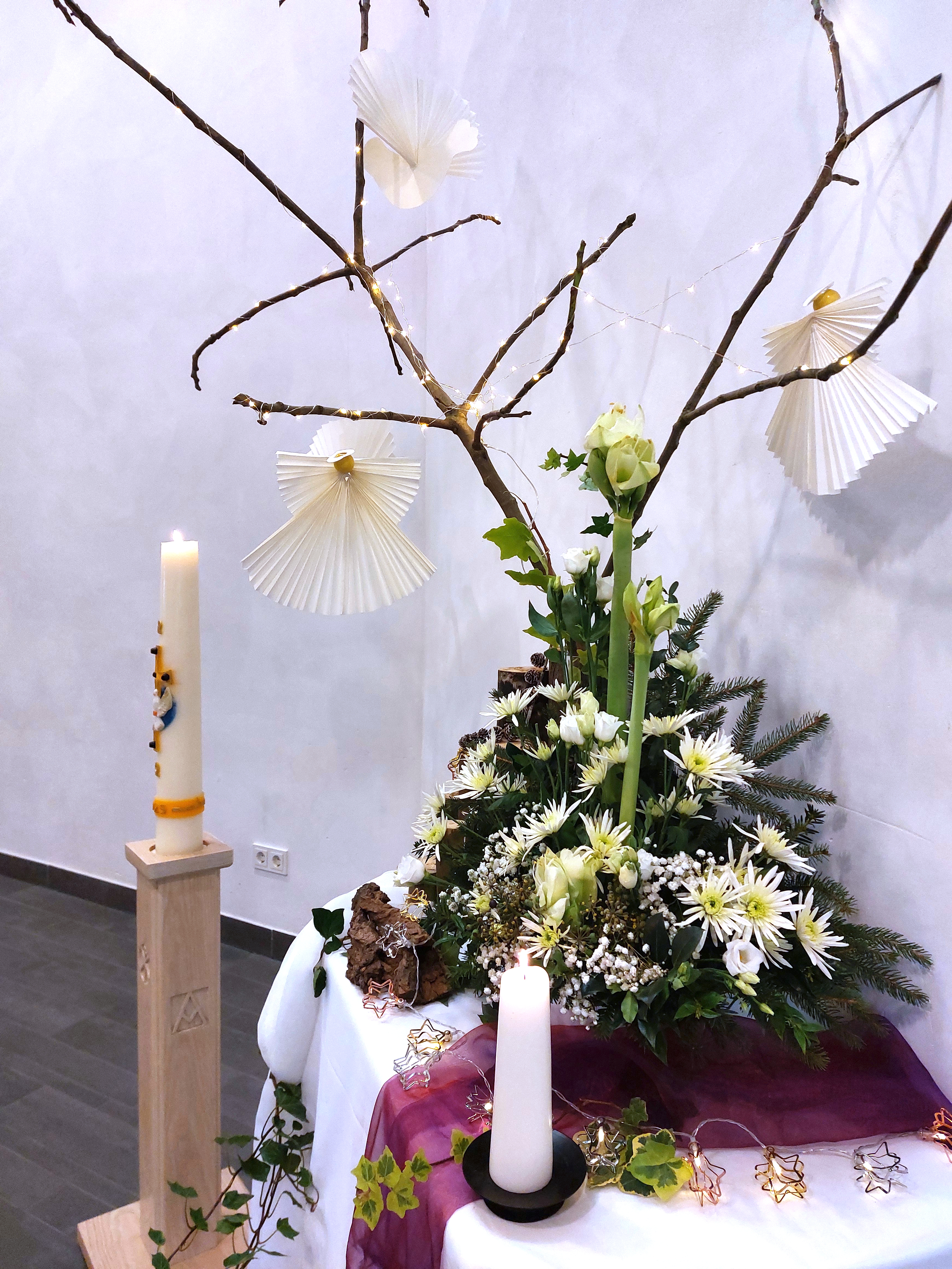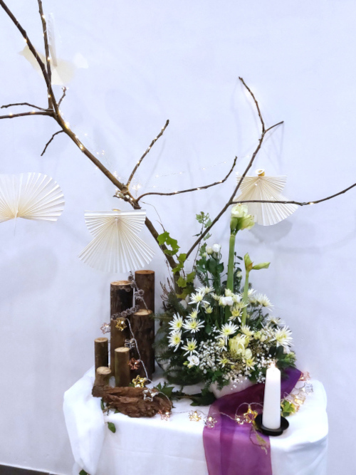 Kerst 2025 - Johannes 1:1-14 De evangelist Johannes begon zijn versie van het evangelie met een terugblik op de schepping. ‘In het begin was het Woord, het Woord was bij God. In het Woord was leven en het leven was het licht voor de mensen.’ Vanuit de schepping van hemel en aarde houdt God zich aan zijn Woord. Zijn Woord is mens geworden. Hoe wonderlijk, machtig en genadig is God: de komst van zijn eigen Zoon, Jezus Christus, het licht der wereld. Dat vieren wij met Kerst. Waar brengt de Geest ons in deze tijd? Laten wij zoeken naar momenten, plekken en manieren om ontvankelijk en opmerkzaam te zijn voor Gods Geest. Bij de liturgische schikking: We zien witte bloemen - rijk en stralend. Grote en kleine, tere, onschuldige, bloemen. De engelen en de duiven zijn er nog. Kleine lichtjes brengen een zachte gloed. Het is een stralend feest van licht, hemel en aarde verbonden door de geboorte van het Kind. Woorden bij de schikking: Het is feest. Zie het wit van de bloemen, hun kelken vol belofte. |
