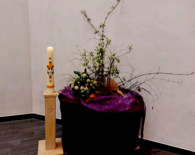 Het getal 5 is het getal van de mens, de mens met zijn 5 zintuigen. Met die zintuigen kunnen we de ander zien, voelen en horen. Bloesems zijn ook bedoeld om vruchten te dragen. De witte kaars staat symbool voor het licht van de wereld. |